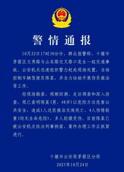 10月25日凌晨,湖北省十堰市公安局茅箭區(qū)分局發(fā)布警情通報:10月22日17時30分許,群眾報警稱,十堰市茅箭區(qū)文秀路與山東路交叉路口發(fā)生一起交通事故。公安機(jī)關(guān)迅速組織警力趕赴現(xiàn)場處置,當(dāng)場控制車輛駕駛員陳某,并全力協(xié)助開展傷員救治等工作。