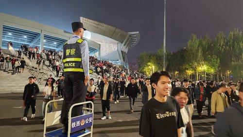 沈陽(yáng)鐵西民警在鐵西體育場(chǎng)周邊疏散觀賽人員。