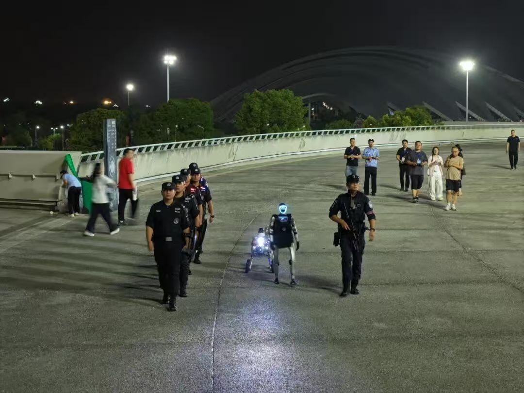 人形機(jī)器人、機(jī)器狗配合安保民警在蘇超賽場(chǎng)開展巡邏