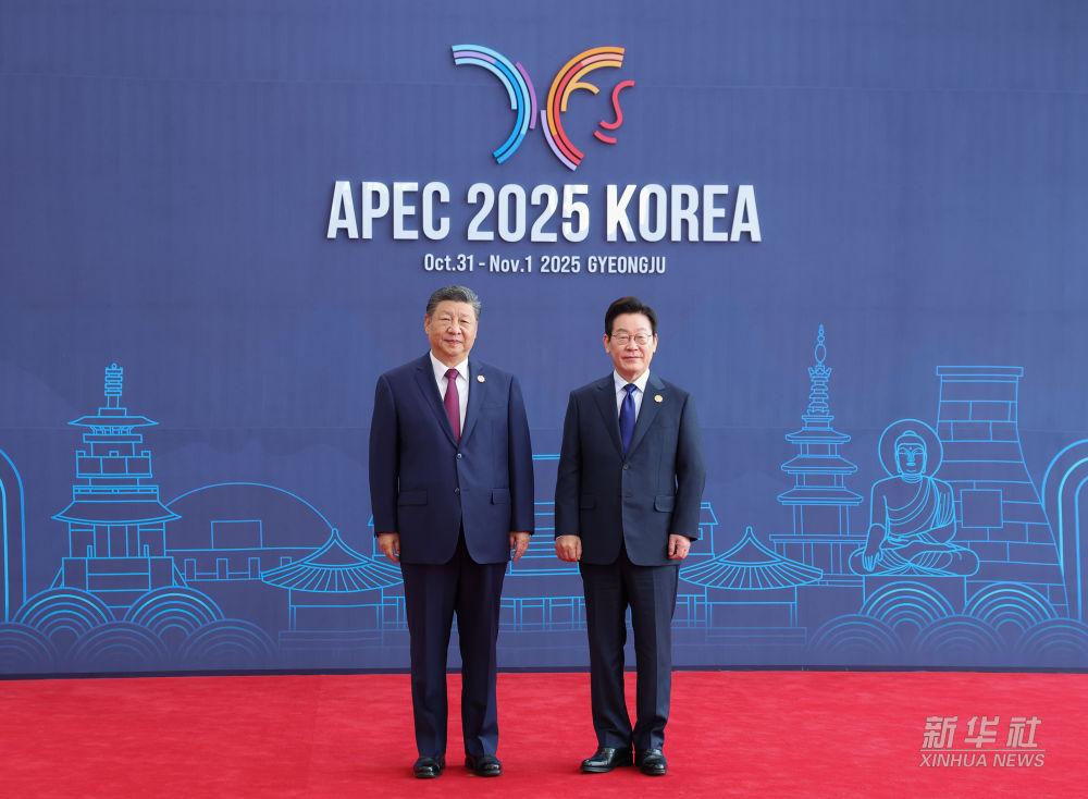 這是習近平抵達會場時,韓國總統李在明熱情迎接。
