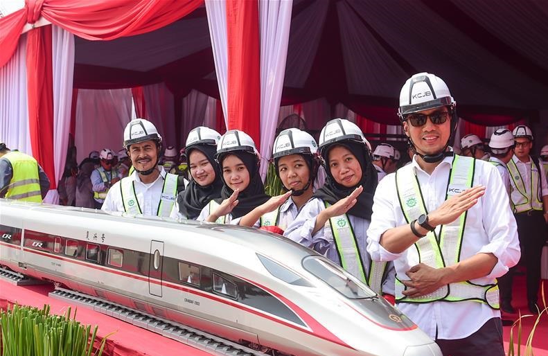 9月30日,在印尼雅萬高鐵首榀箱梁架設(shè)現(xiàn)場,幾名印尼嘉賓與“復(fù)興號”動車模型合影。 新華社記者 杜宇 攝