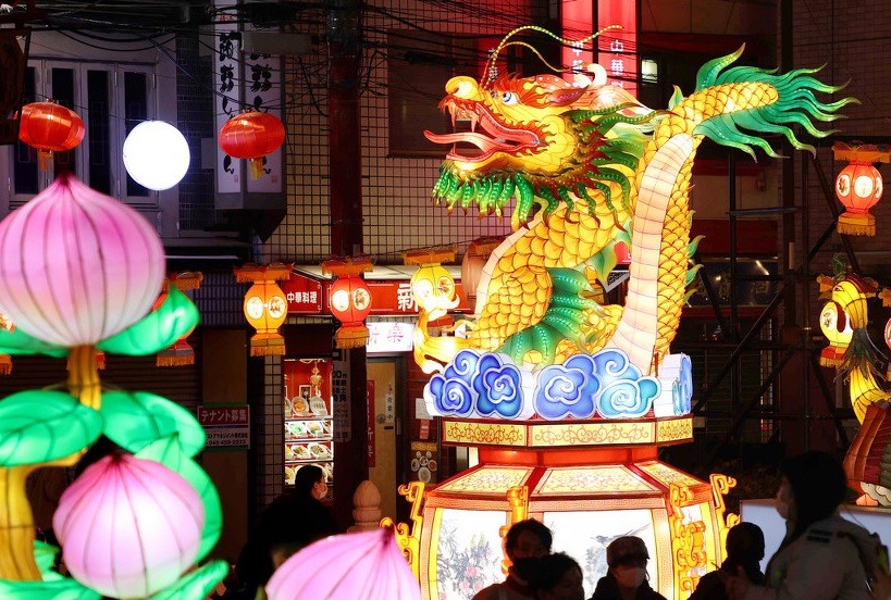 人民網訊 當?shù)貢r間2月13日,為慶祝中國農歷新年,日本橫濱中華街展出以中國文化為主題的花燈,為當?shù)貛硇麓旱南矐c氣息。