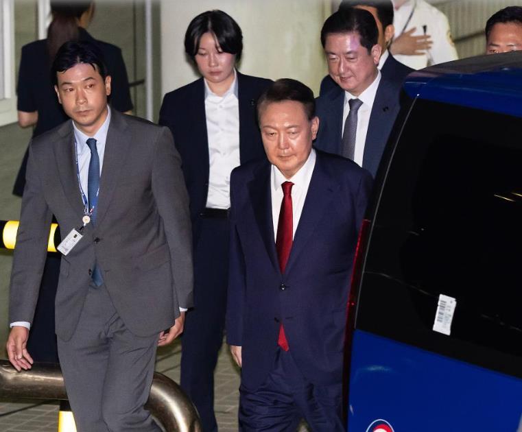 7月9日晚,韓國前總統(tǒng)尹錫悅接受訊問后走出首爾中央地方法院。新華社/紐西斯通訊社