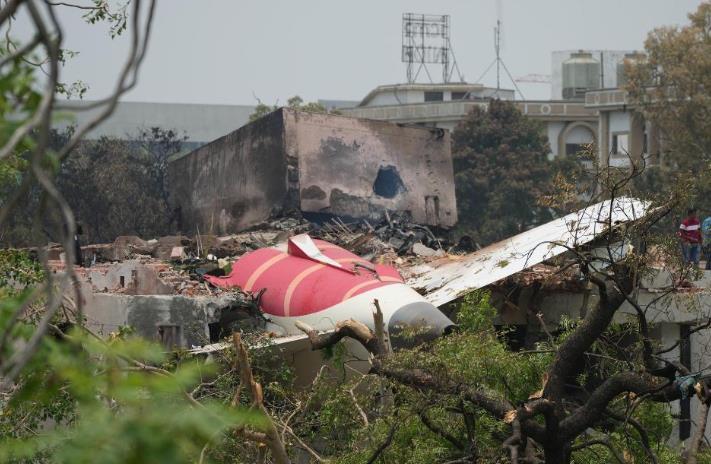 6月13日,在印度古吉拉特邦艾哈邁達(dá)巴德,幾名男子站在客機(jī)殘骸旁。新華社發(fā)