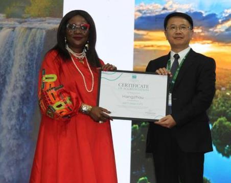 7月24日,在津巴布韋維多利亞瀑布城開幕的《濕地公約》第十五屆締約方大會(huì)上,《濕地公約》秘書長(zhǎng)穆松達(dá)·蒙巴為中國(guó)浙江杭州代表頒發(fā)“國(guó)際濕地城市”證書。新華社發(fā)(塔法拉攝)