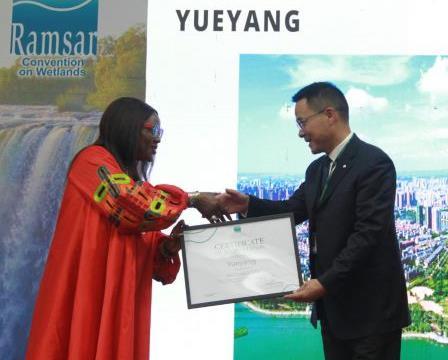 7月24日,在津巴布韋維多利亞瀑布城開幕的《濕地公約》第十五屆締約方大會(huì)上,《濕地公約》秘書長(zhǎng)穆松達(dá)·蒙巴為中國(guó)湖南岳陽(yáng)代表頒發(fā)“國(guó)際濕地城市”證書。新華社發(fā)(塔法拉攝)
