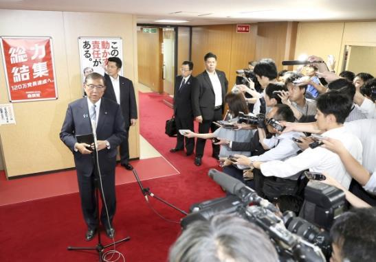 圖為當?shù)貢r間7月23日,日本東京,日本首相石破茂在自民黨總部與三位前首相會晤后回答記者提問。 CFP供圖