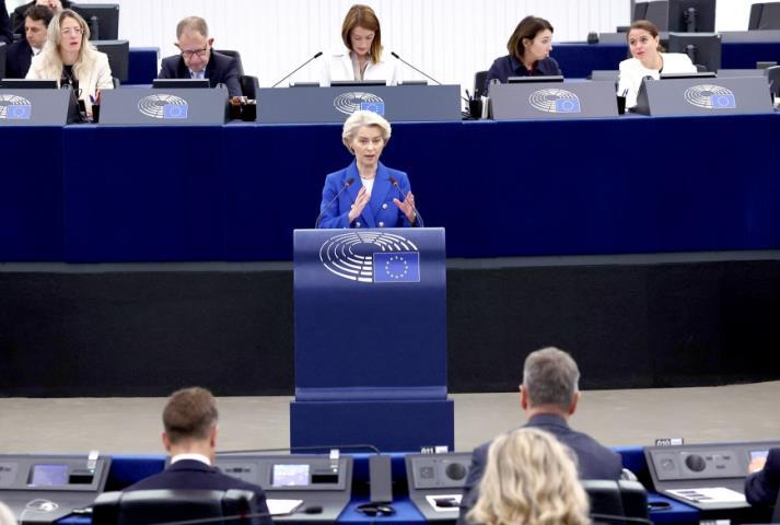 圖為當地時間10月8日,法國斯特拉斯堡,歐盟委員會主席馮德萊恩在歐洲議會發(fā)言時談及構筑“無人機墻”相關問題。 CFP供圖