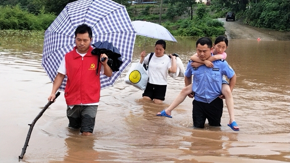 近日,湖南省瀘溪縣公安局浦市派出所輔警與村干部轉(zhuǎn)移被困群眾。王文良 攝