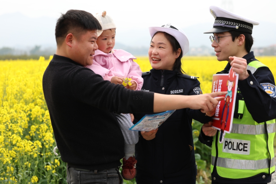 3月11日,江西省吉安市遂川縣舉辦以“花海遂川·美麗田園·共赴春日盛宴”為主題的油菜花賞花季活動(dòng)。遂川縣公安局交警大隊(duì)全力維護(hù)沿線道路交通秩序,并組織民輔警走進(jìn)花海,向游客宣傳交通安全法律法規(guī)。