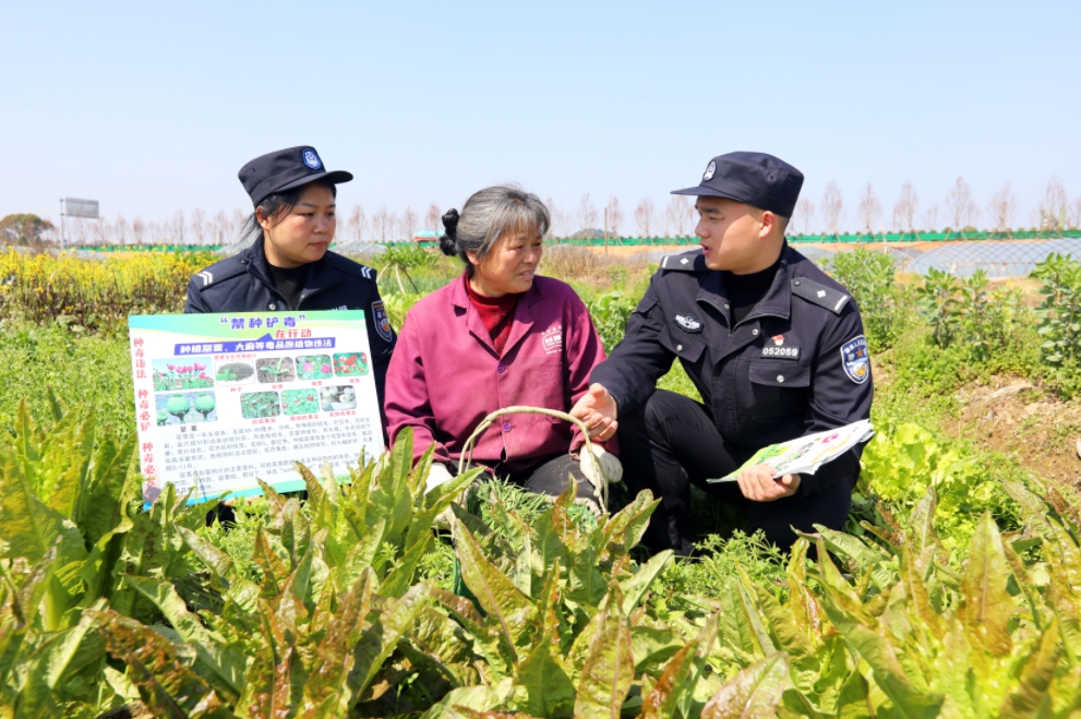 圖為民警走進(jìn)田間地頭向群眾宣傳禁種鏟毒知識(shí)。