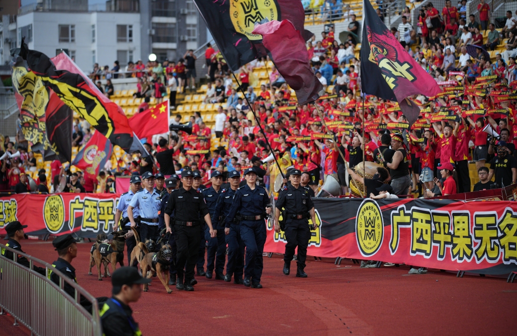 每逢平果市主場(chǎng)比賽日,各地球迷都會(huì)早早來到體育場(chǎng)外為球隊(duì)吶喊助威。而比球迷更早到達(dá)的,是平果市公安局的民輔警和安保人員?!懊繄?chǎng)比賽前,民警會(huì)提前4個(gè)小時(shí)到達(dá)現(xiàn)場(chǎng)開展安全排爆工作。場(chǎng)內(nèi)近3萬個(gè)座位、每一條過道、每一個(gè)看臺(tái),以及場(chǎng)外的每一個(gè)重點(diǎn)區(qū)域,我們都要認(rèn)真排查?!逼焦泄簿指本珠L黃漢杰說。