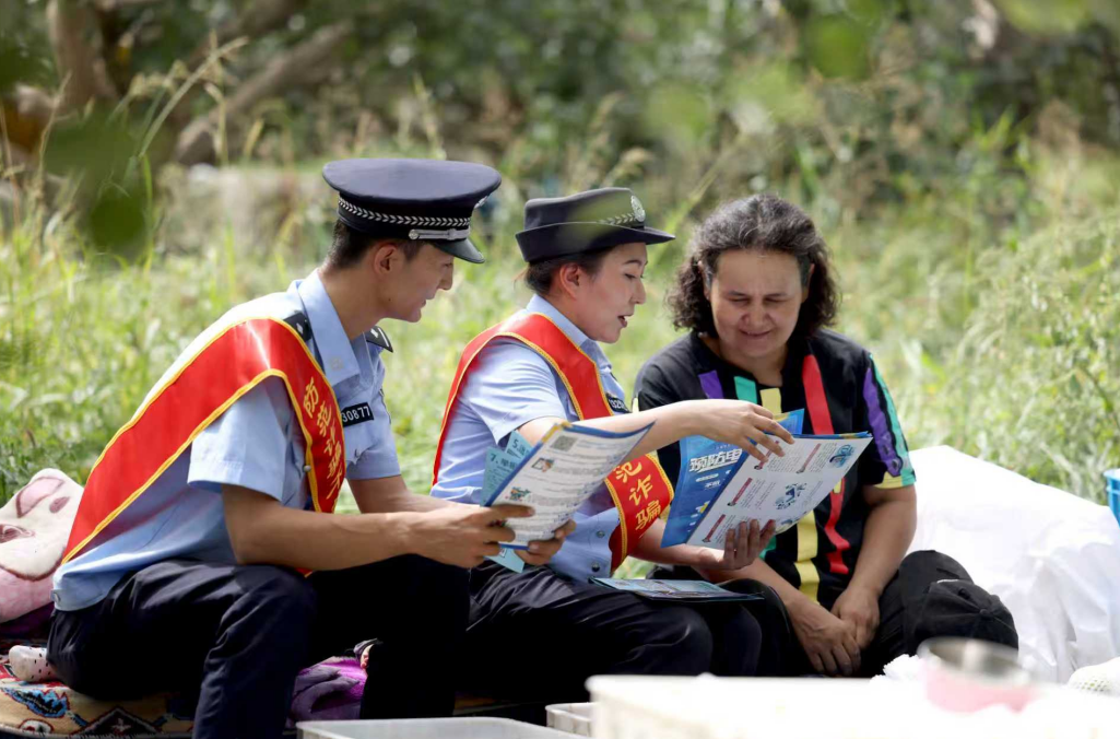 圖為庫(kù)爾勒市公安局阿瓦提鄉(xiāng)派出所民警在果園開(kāi)展反詐宣傳。阿布拉江·塔依爾 攝