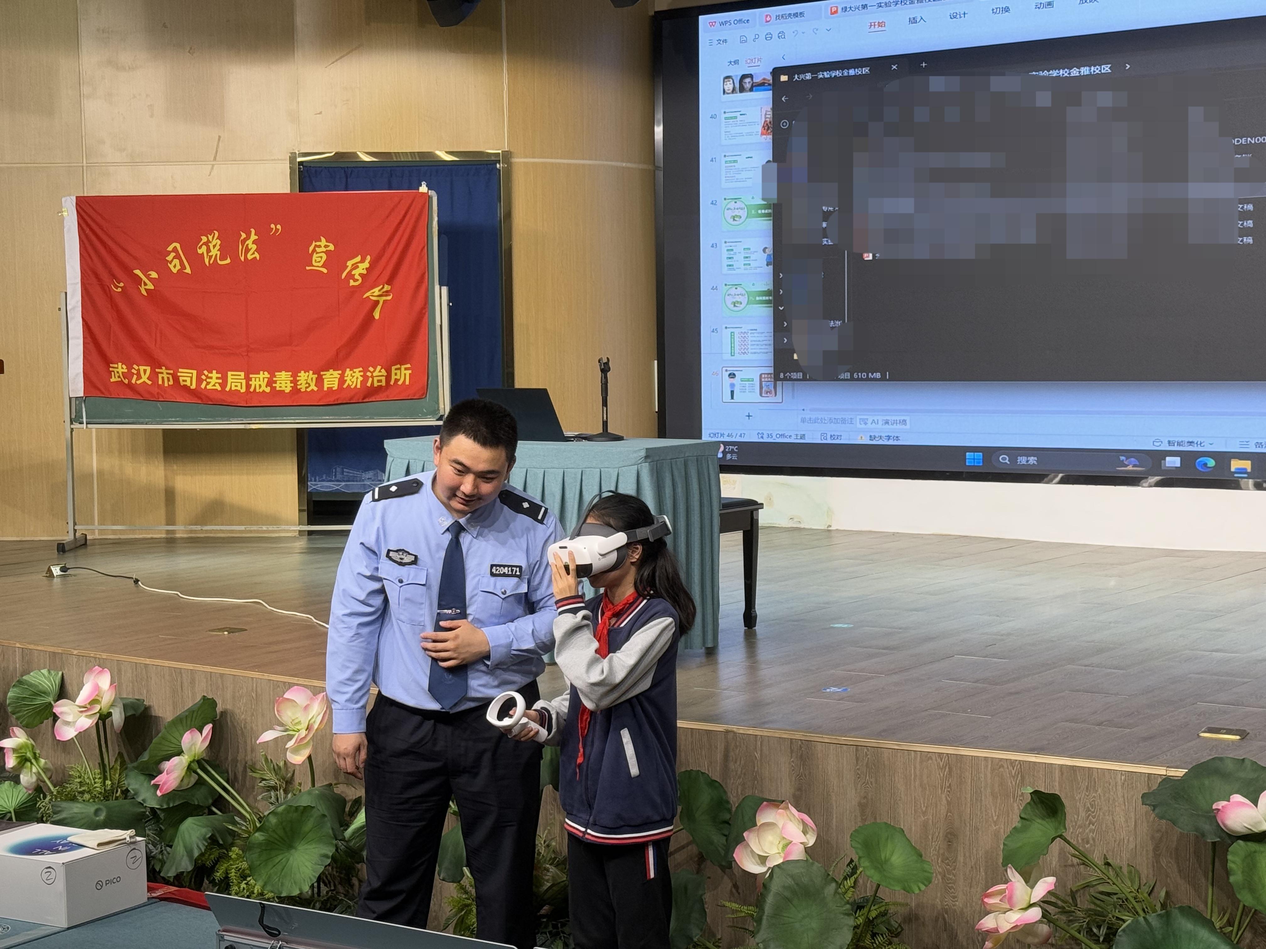 圖為戒毒民警引導(dǎo)學(xué)生通過VR設(shè)備體驗毒品的危害。