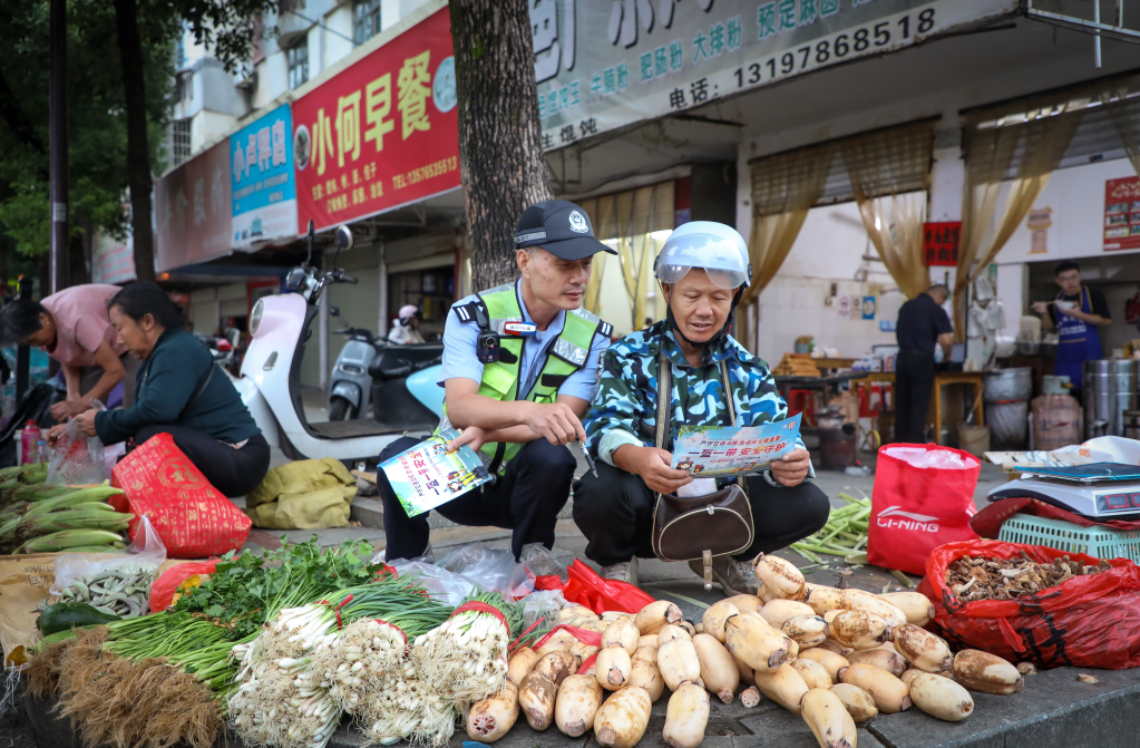 10月15日,江西省宜豐縣公安局交管大隊(duì)組織民輔警深入轄區(qū)早市,向群眾開(kāi)展以“戴好頭盔、安全出行”為主題的宣傳活動(dòng),擰緊人間煙火氣的“安全閥”。