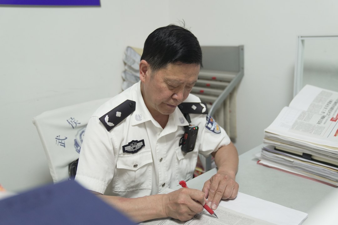 每天早會前,所上的老“國優(yōu)”、社區(qū)警務(wù)隊民警郭學(xué)彬在辦公桌前翻看工作筆記本,本上認認真真手寫記錄著每日工作、例會內(nèi)容、重點任務(wù)、完成情況……他逐頁翻看更新,對照完成進度“銷賬”。