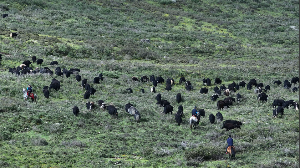昌戈村夏季牧場地勢平坦,擁有豐富的水草資源,海拔高達4800米。這里,不僅是牦牛的理想棲息地,也是牧民群眾最理想的牧場之一。此次遷徙轉(zhuǎn)場中,昌戈村牧民呷波、扎西多吉等4家500多頭牦牛浩浩蕩蕩“組團”前行。