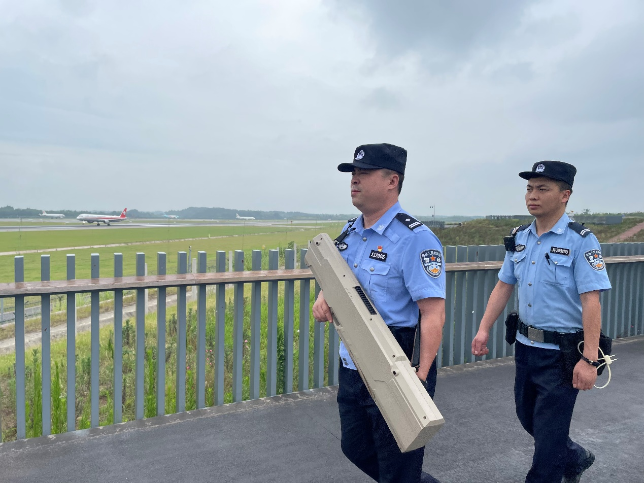 天府國(guó)際機(jī)場(chǎng)跑道一側(cè)的萌獅公園,是觀看飛機(jī)起降、一覽機(jī)場(chǎng)全貌的最佳地點(diǎn),吸引了不少游客前來(lái)拍照打卡。7月18日,東部新區(qū)公安分局草池派出所的民輔警背著分局配發(fā)的無(wú)人機(jī)反制槍,與“凈空觀察哨”隊(duì)員在公園里開(kāi)展巡邏工作:檢查機(jī)場(chǎng)防護(hù)網(wǎng)是否遭到破壞,在觀察哨瞭望是否有風(fēng)箏、氣球等升空物體干擾航班的情況,向游客進(jìn)行凈空安全知識(shí)的宣傳。