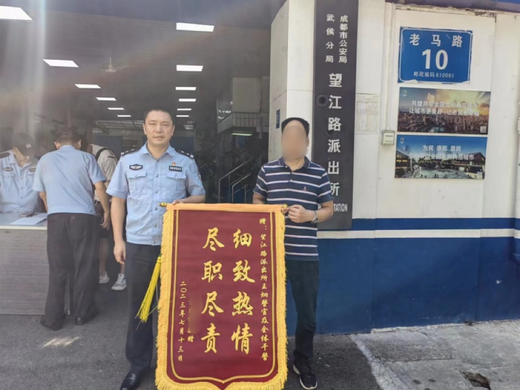 “謝謝警察同志,這么快就幫我把手機找回來了!”近日,方先生將一面印有“細致熱情 盡職盡責”的錦旗送到了望江路派出所教導員彭偉手中,對派出所民警快速為其追回手機表示誠摯感謝。