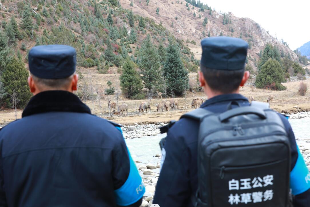 近日,四川省甘孜州白玉縣公安局森警大隊和安孜派出所民輔警聯(lián)合巡山途中,在麻絨鄉(xiāng)察青松多自然保護區(qū)偶遇上百只下山喝水覓食的國家一級保護野生動物白唇鹿。