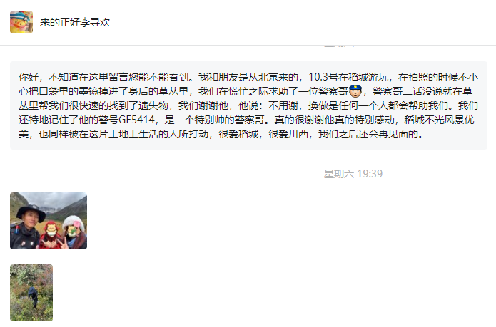 “你好,不知道在這里留言您能不能看到。我和朋友是從北京來的,10月3號日在稻城游玩,在拍照的時候不小心把口袋里的墨鏡掉進了身后的草叢里,我們在慌忙之際求助了一位警察哥,警察哥二話沒說就在草叢里幫我們很快速的找到了遺失物,我們謝謝他,他說:不用謝,換做是任何一個人都會幫助我們。我們還特地記住了他的警號GF5414,是一個特別帥的警察哥。真的很謝謝他真的特別感動,稻城不光風景優(yōu)美,也同樣被在這片土地上生活的人所打動,很愛稻城,很愛川西,我們之后還會再見面的?!?/p>