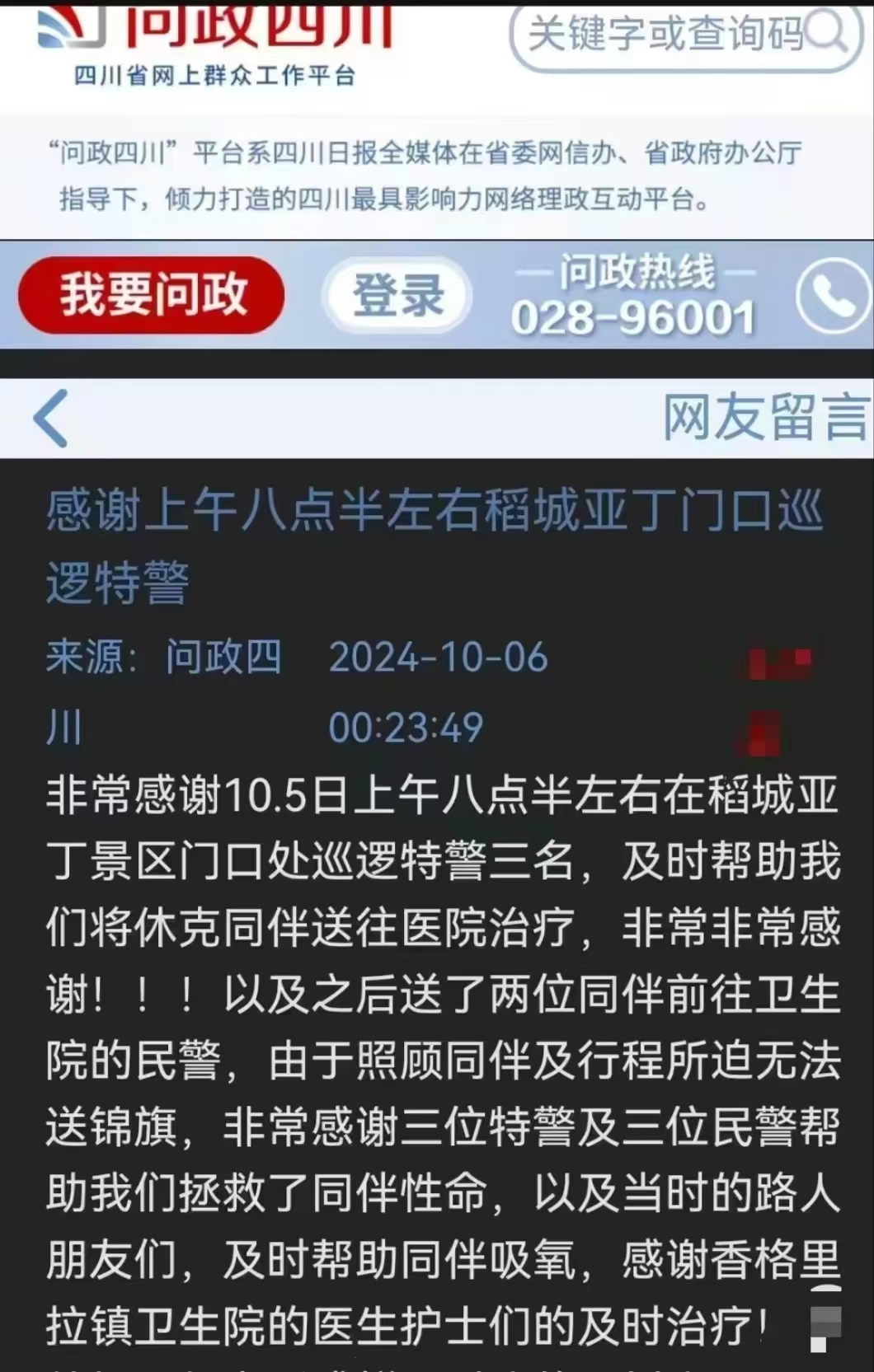 “非常感謝10月5日上午8點半,在亞丁景區(qū)門口的三位特巡警,將我們休克的同伴及時送往醫(yī)院治療。由于照顧同伴及行程所迫無法送錦旗,但這份恩情我們永遠銘記在心!”10月6日,一封來自游客的感謝信投遞在“問政四川”平臺上,信中充滿了他對眾多好心人的感激之情。據(jù)稻城縣公安局特巡警大隊副大隊長四郎澤仁介紹,10月5日,亞丁景區(qū)迎來眾多游客。我和隊員們正在景區(qū)門口的執(zhí)勤點位上執(zhí)勤,確保游客的安全和秩序。突然,聽到一陣急促的呼救聲,我們立刻循聲跑去,只見一名女游客倒在地上,身體不停地發(fā)抖,已經(jīng)陷入休克狀態(tài)?!懊鎸@突如其來的緊急情況,我們按照日常養(yǎng)成的急救常識,立即對游客進行了初步判斷,根據(jù)其癥狀和表現(xiàn),我們判斷是由于缺氧所導致的,并立即對她進行了初步的搶救?!痹诔醪綋尵群?,該游客的情況雖有所緩解。于是,我和我的戰(zhàn)友們立即開辟起一條“綠色通道”,用警車將患者轉(zhuǎn)送至鎮(zhèn)衛(wèi)生院。為了不浪費任何一分鐘的治療時間,到達衛(wèi)生院后特巡警隊員將患者背上,送入診療室。當看到游客在醫(yī)生的救治下逐漸恢復意識,我們懸著的心也終于放了下來。那一刻,我們深深地感受到了作為一名警察的責任和使命。