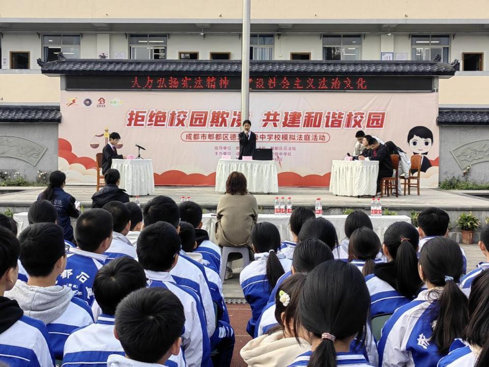 在德源中學(xué),一場別開生面的“模擬法庭”活動(dòng)正在莊嚴(yán)地進(jìn)行,庭審中,15名青少年化身審判員、書記員、公訴人、辯護(hù)人、法警等角色,共同參與審理一起校園欺凌案件,活動(dòng)通過還原庭審過程,讓師生們“沉浸式”感受法律威嚴(yán)?;顒?dòng)中,德源司法所的工作人員還為同學(xué)們送上憨態(tài)可掬的“法治熊貓”。