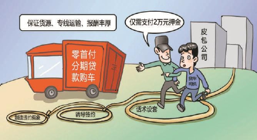 “我看公司挺正規(guī)的,這個(gè)經(jīng)理也很專(zhuān)業(yè),最關(guān)鍵的是,這個(gè)工資待遇算是很高的了,所以我立即就簽了合同?!毙》痘貞浾f(shuō)。簽約后,根據(jù)公司要求,小范先交納了一大筆押金。原來(lái),想要賺這份“高薪”,首先要根據(jù)簽約年限交給公司一筆1萬(wàn)元至2萬(wàn)元不等的押金。由于小范沒(méi)有自己的貨車(chē),張經(jīng)理便要求他交納2萬(wàn)元的押金,隨后幫他聯(lián)系4S店零首付分期貸款購(gòu)買(mǎi)車(chē)輛,并承諾小范“如果以后不再跑物流,隨時(shí)可以把車(chē)子過(guò)戶(hù)到公司名下,不再還貸”。