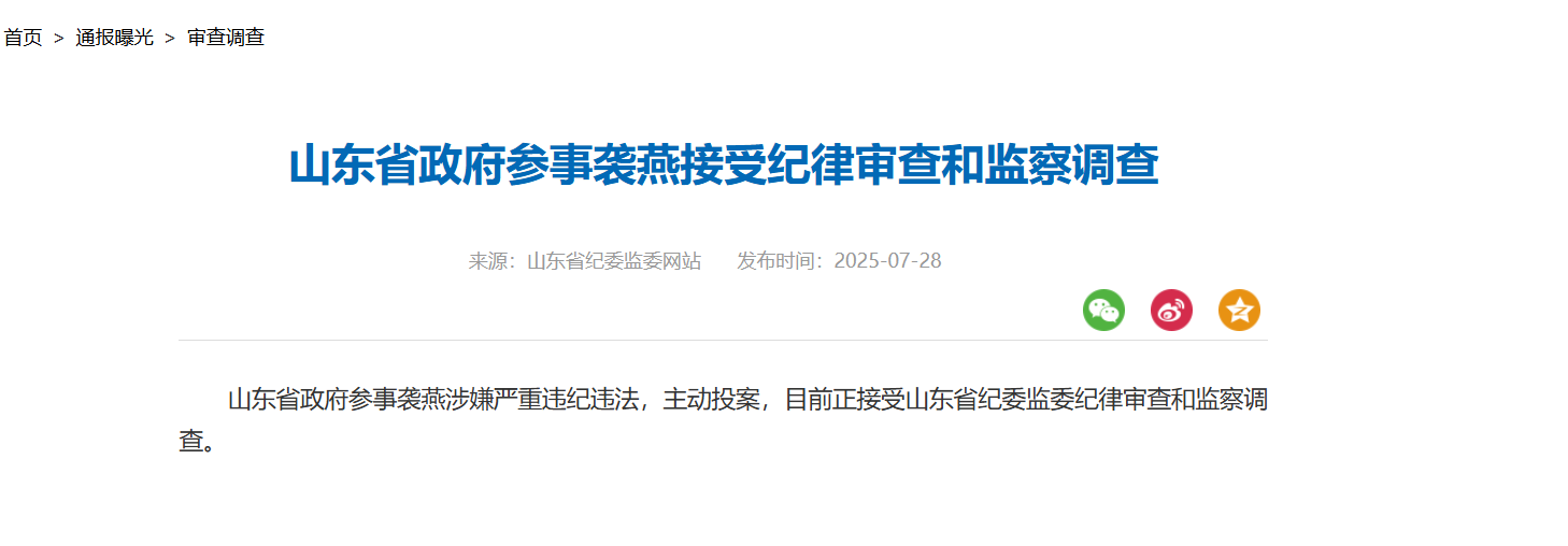 7月28日,據(jù)山東省紀(jì)委監(jiān)委網(wǎng)站消息,山東省政府參事襲燕涉嫌嚴(yán)重違紀(jì)違法,主動投案,目前正接受山東省紀(jì)委監(jiān)委紀(jì)律審查和監(jiān)察調(diào)查。