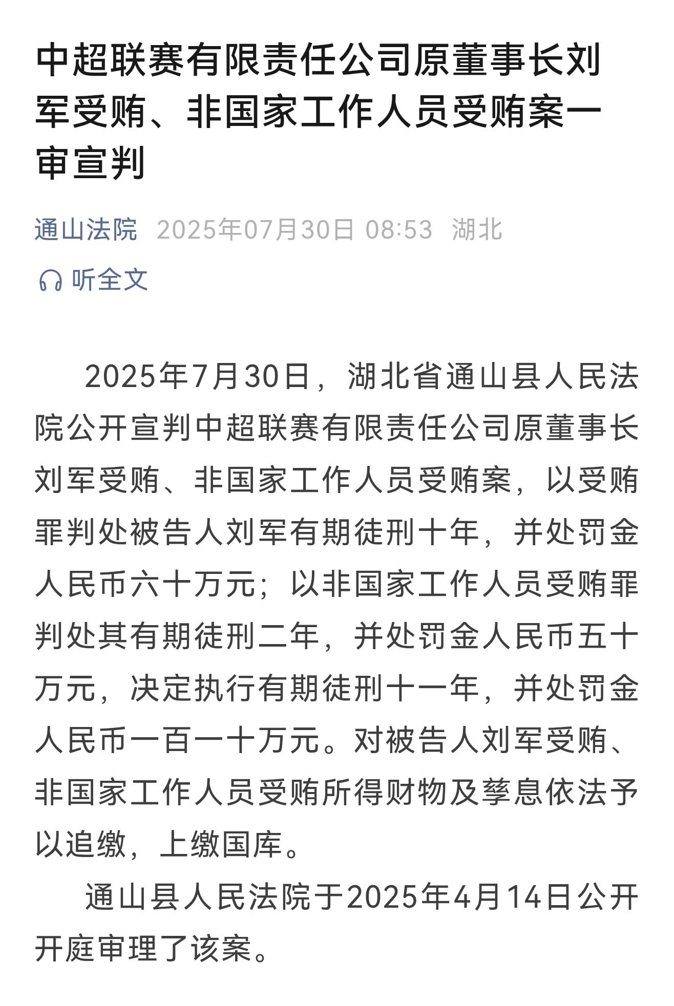 通山縣人民法院以受賄罪判處被告人劉軍有期徒刑十年,并處罰金人民幣六十萬元;以非國(guó)家工作人員受賄罪判處其有期徒刑二年,并處罰金人民幣五十萬元,決定執(zhí)行有期徒刑十一年,并處罰金人民幣一百一十萬元。對(duì)被告人劉軍受賄、非國(guó)家工作人員受賄所得財(cái)物及孳息依法予以追繳,上繳國(guó)庫。通山縣法院于2025年4月14日公開開庭審理了該案。