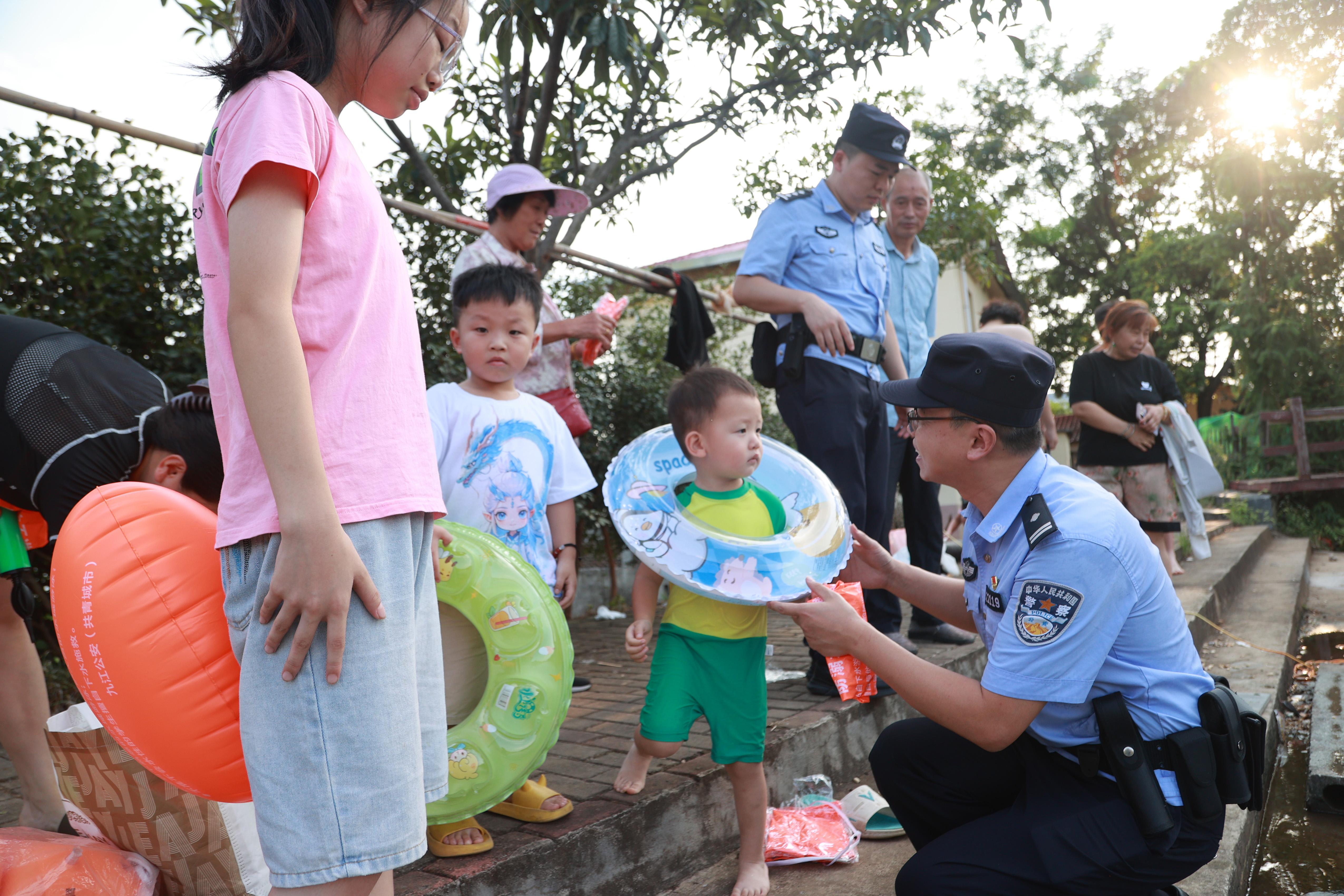 圖為7月30日,民警在鄉(xiāng)村池塘開展防溺水知識宣講并向小朋友贈送救生浮袋。