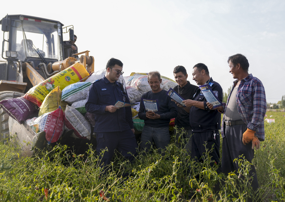 圖為10月12日,輪臺縣公安局阿克薩來鄉(xiāng)派出所民輔警深入田間地頭開展反詐普法宣傳。