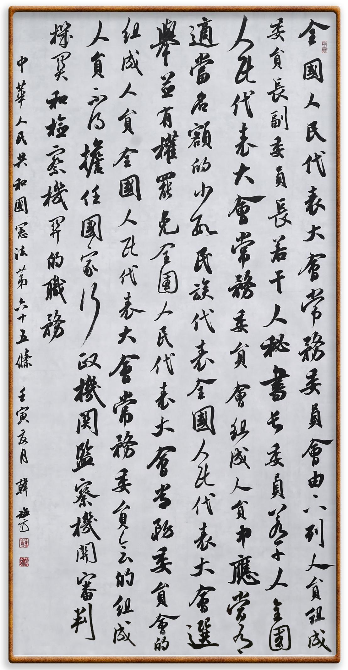 繼《中華人民共和國(guó)民法典》《中華人民共和國(guó)土地管理法》《中華人民共和國(guó)土地管理法實(shí)施條例》《中華人民共和國(guó)法律援助法》之后,法治日?qǐng)?bào)社聯(lián)合北京市司法局、北京書(shū)法家協(xié)會(huì),將筆端對(duì)準(zhǔn)《中華人民共和國(guó)憲法》和《中華人民共和國(guó)行政處罰法》。