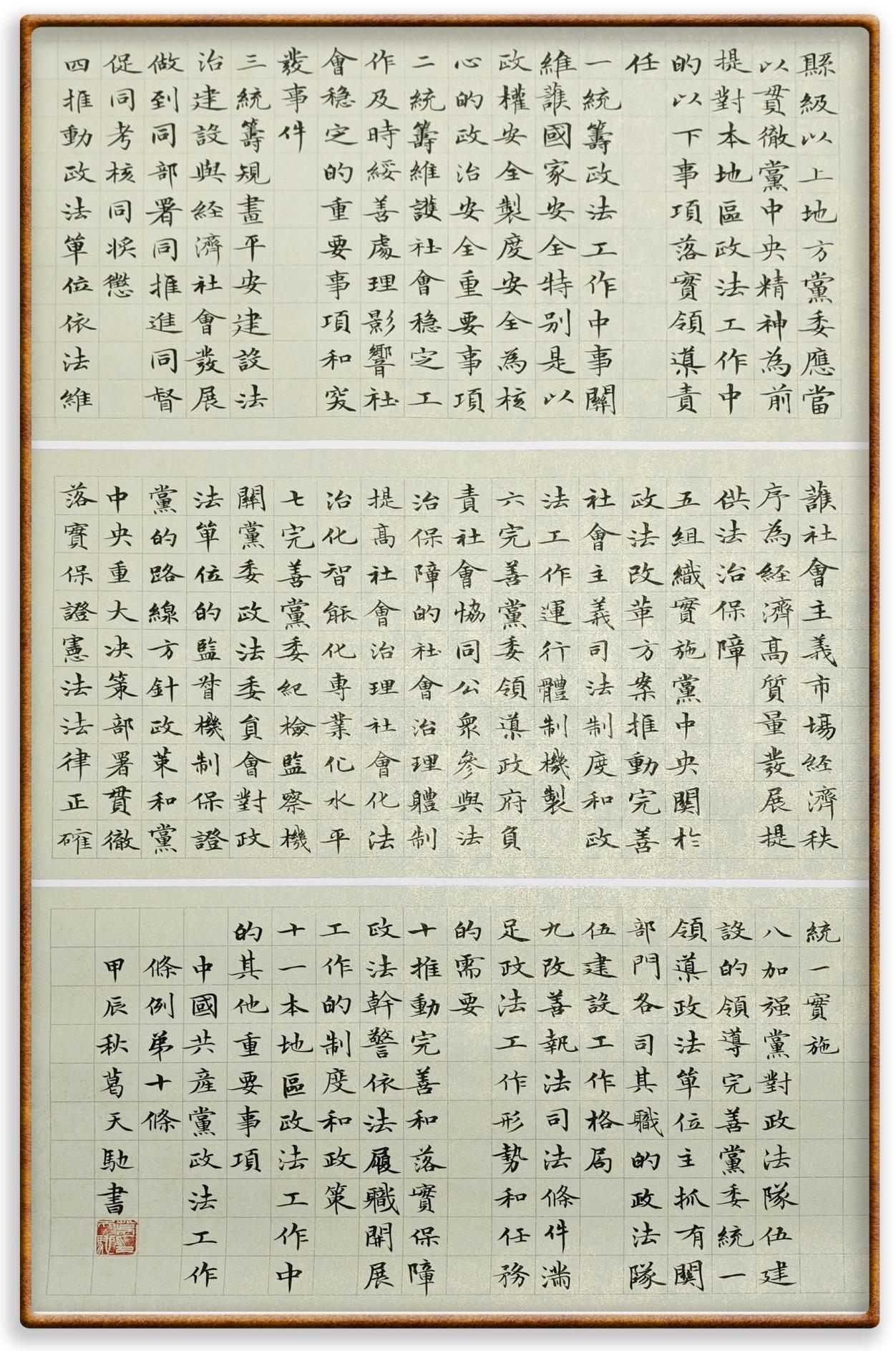 《中國共產(chǎn)黨政法工作條例》對黨領導新時代政法工作進行全面制度擘畫,為黨領導政法工作提供基本遵循,具有重大而深遠的意義。為學習好、宣傳好、貫徹好、實施好這部黨內法規(guī),繼《中華人民共和國民法典》《中華人民共和國憲法》《信訪工作條例》《中華人民共和國澳門特別行政區(qū)基本法》《中華人民共和國香港特別行政區(qū)基本法》等法律法規(guī)之后,“書·法”系列活動將筆端對準《中國共產(chǎn)黨政法工作條例》。