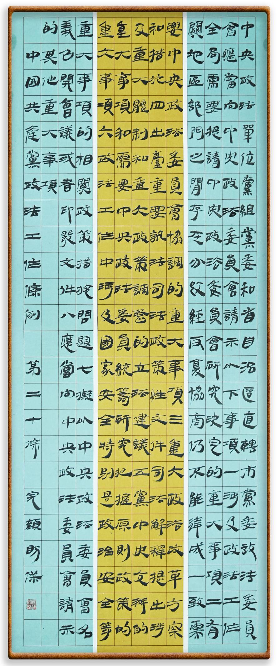 《中國(guó)共產(chǎn)黨政法工作條例》對(duì)黨領(lǐng)導(dǎo)新時(shí)代政法工作進(jìn)行全面制度擘畫,為黨領(lǐng)導(dǎo)政法工作提供基本遵循,具有重大而深遠(yuǎn)的意義。為學(xué)習(xí)好、宣傳好、貫徹好、實(shí)施好這部黨內(nèi)法規(guī),繼《中華人民共和國(guó)民法典》《中華人民共和國(guó)憲法》《信訪工作條例》《中華人民共和國(guó)澳門特別行政區(qū)基本法》《中華人民共和國(guó)香港特別行政區(qū)基本法》等法律法規(guī)之后,“書·法”系列活動(dòng)將筆端對(duì)準(zhǔn)《中國(guó)共產(chǎn)黨政法工作條例》。