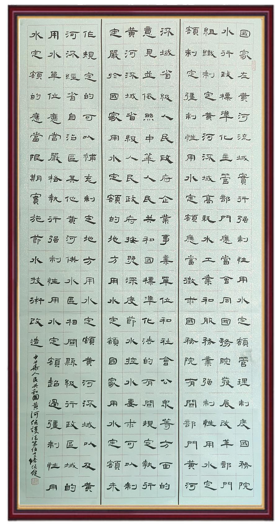 黃河寧,天下平。黃河是中華民族的發(fā)源地和搖籃,保護(hù)黃河是事關(guān)中華民族偉大復(fù)興的千秋大計(jì)?!吨腥A人民共和國(guó)黃河保護(hù)法》為推進(jìn)水資源節(jié)約集約利用、保護(hù)傳承弘揚(yáng)黃河文化、推動(dòng)黃河流域生態(tài)保護(hù)和高質(zhì)量發(fā)展提供了有力法治保障。繼書寫《中華人民共和國(guó)民法典》《中華人民共和國(guó)憲法》《中華人民共和國(guó)澳門特別行政區(qū)基本法》《中華人民共和國(guó)香港特別行政區(qū)基本法》《中華人民共和國(guó)國(guó)旗法》《中華人民共和國(guó)國(guó)徽法》《中華人民共和國(guó)國(guó)歌法》《中華人民共和國(guó)法官法》等法律法規(guī)之后,法制日?qǐng)?bào)社聯(lián)合沿黃九?。▍^(qū))司法廳、書法家協(xié)會(huì),將筆端對(duì)準(zhǔn)《中華人民共和國(guó)黃河保護(hù)法》。