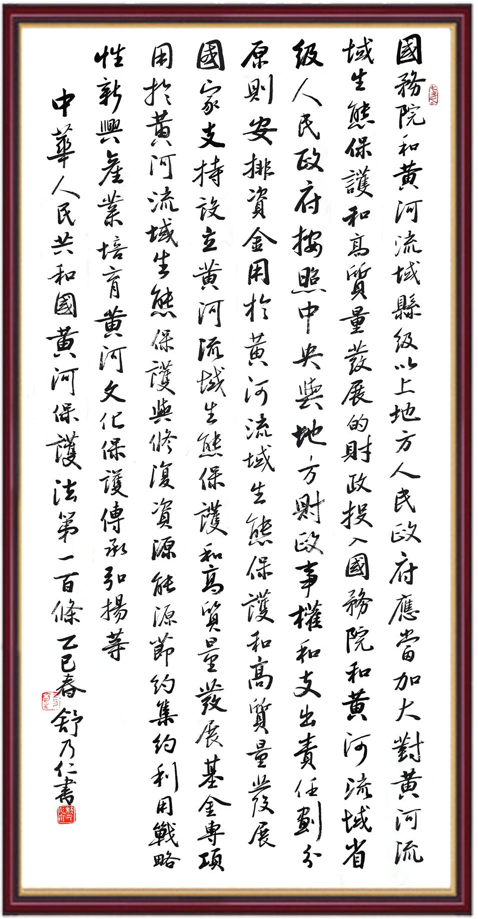 黃河寧,天下平。黃河是中華民族的發(fā)源地和搖籃,保護(hù)黃河是事關(guān)中華民族偉大復(fù)興的千秋大計(jì)?!吨腥A人民共和國(guó)黃河保護(hù)法》為推進(jìn)水資源節(jié)約集約利用、保護(hù)傳承弘揚(yáng)黃河文化、推動(dòng)黃河流域生態(tài)保護(hù)和高質(zhì)量發(fā)展提供了有力法治保障。繼書(shū)寫(xiě)《中華人民共和國(guó)民法典》《中華人民共和國(guó)憲法》《中華人民共和國(guó)澳門(mén)特別行政區(qū)基本法》《中華人民共和國(guó)香港特別行政區(qū)基本法》《中華人民共和國(guó)國(guó)旗法》《中華人民共和國(guó)國(guó)徽法》《中華人民共和國(guó)國(guó)歌法》《中華人民共和國(guó)法官法》等法律法規(guī)之后,法制日?qǐng)?bào)社聯(lián)合沿黃九省(區(qū))司法廳、書(shū)法家協(xié)會(huì),將筆端對(duì)準(zhǔn)《中華人民共和國(guó)黃河保護(hù)法》。