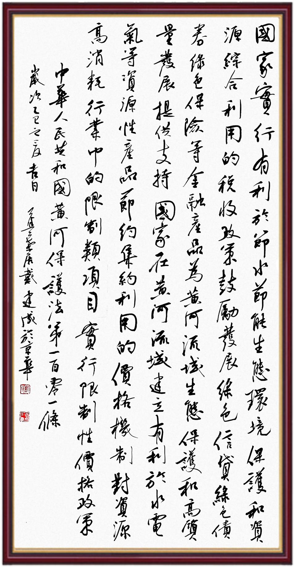 黃河寧,天下平。黃河是中華民族的發(fā)源地和搖籃,保護(hù)黃河是事關(guān)中華民族偉大復(fù)興的千秋大計(jì)。《中華人民共和國黃河保護(hù)法》為推進(jìn)水資源節(jié)約集約利用、保護(hù)傳承弘揚(yáng)黃河文化、推動(dòng)黃河流域生態(tài)保護(hù)和高質(zhì)量發(fā)展提供了有力法治保障。繼書寫《中華人民共和國民法典》《中華人民共和國憲法》《中華人民共和國澳門特別行政區(qū)基本法》《中華人民共和國香港特別行政區(qū)基本法》《中華人民共和國國旗法》《中華人民共和國國徽法》《中華人民共和國國歌法》《中華人民共和國法官法》等法律法規(guī)之后,法制日?qǐng)?bào)社聯(lián)合沿黃九?。▍^(qū))司法廳、書法家協(xié)會(huì),將筆端對(duì)準(zhǔn)《中華人民共和國黃河保護(hù)法》。