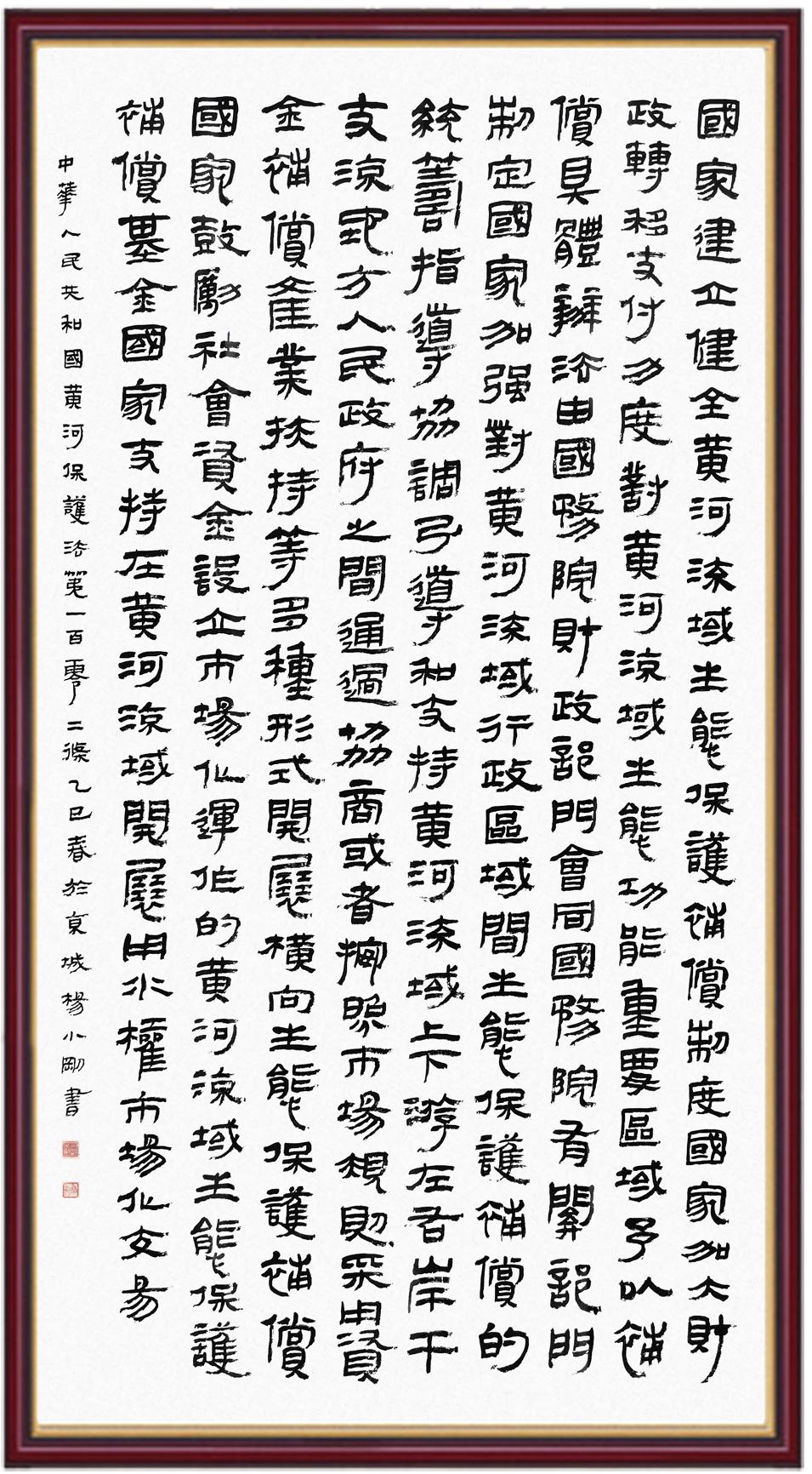 黃河寧,天下平。黃河是中華民族的發(fā)源地和搖籃,保護(hù)黃河是事關(guān)中華民族偉大復(fù)興的千秋大計(jì)?!吨腥A人民共和國(guó)黃河保護(hù)法》為推進(jìn)水資源節(jié)約集約利用、保護(hù)傳承弘揚(yáng)黃河文化、推動(dòng)黃河流域生態(tài)保護(hù)和高質(zhì)量發(fā)展提供了有力法治保障。繼書(shū)寫(xiě)《中華人民共和國(guó)民法典》《中華人民共和國(guó)憲法》《中華人民共和國(guó)澳門(mén)特別行政區(qū)基本法》《中華人民共和國(guó)香港特別行政區(qū)基本法》《中華人民共和國(guó)國(guó)旗法》《中華人民共和國(guó)國(guó)徽法》《中華人民共和國(guó)國(guó)歌法》《中華人民共和國(guó)法官法》等法律法規(guī)之后,法制日?qǐng)?bào)社聯(lián)合沿黃九省(區(qū))司法廳、書(shū)法家協(xié)會(huì),將筆端對(duì)準(zhǔn)《中華人民共和國(guó)黃河保護(hù)法》。
