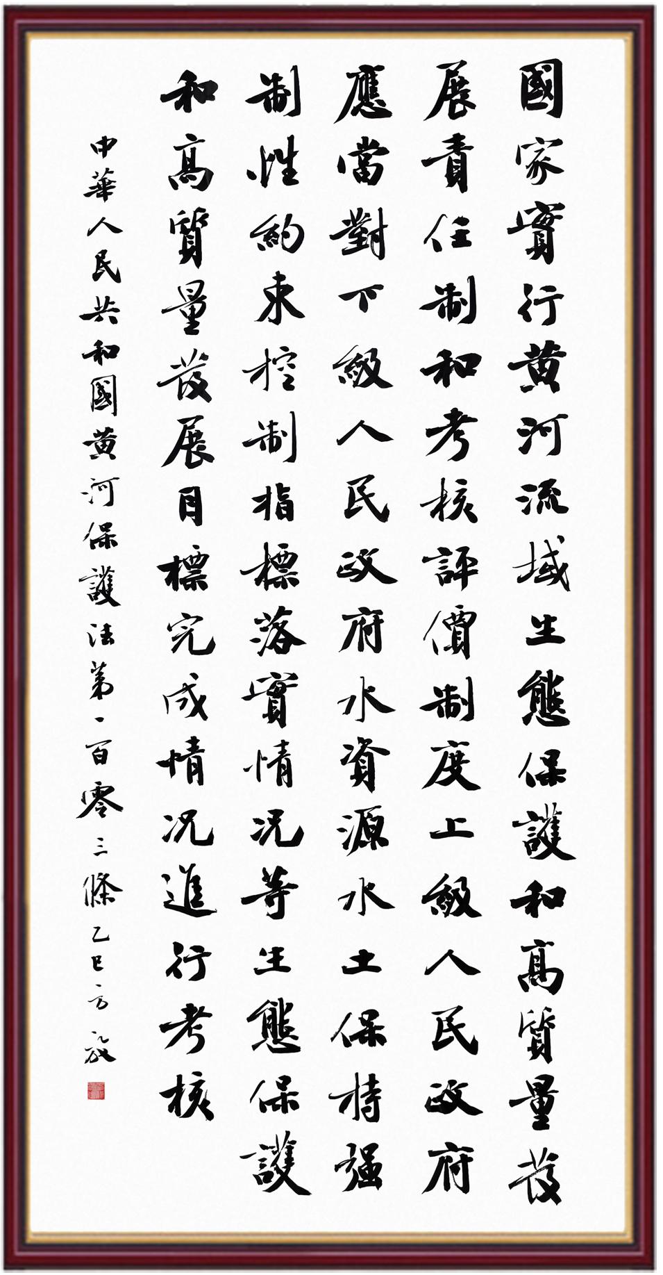 黃河寧,天下平。黃河是中華民族的發(fā)源地和搖籃,保護(hù)黃河是事關(guān)中華民族偉大復(fù)興的千秋大計(jì)。《中華人民共和國(guó)黃河保護(hù)法》為推進(jìn)水資源節(jié)約集約利用、保護(hù)傳承弘揚(yáng)黃河文化、推動(dòng)黃河流域生態(tài)保護(hù)和高質(zhì)量發(fā)展提供了有力法治保障。繼書寫《中華人民共和國(guó)民法典》《中華人民共和國(guó)憲法》《中華人民共和國(guó)澳門特別行政區(qū)基本法》《中華人民共和國(guó)香港特別行政區(qū)基本法》《中華人民共和國(guó)國(guó)旗法》《中華人民共和國(guó)國(guó)徽法》《中華人民共和國(guó)國(guó)歌法》《中華人民共和國(guó)法官法》等法律法規(guī)之后,法制日?qǐng)?bào)社聯(lián)合沿黃九省(區(qū))司法廳、書法家協(xié)會(huì),將筆端對(duì)準(zhǔn)《中華人民共和國(guó)黃河保護(hù)法》。