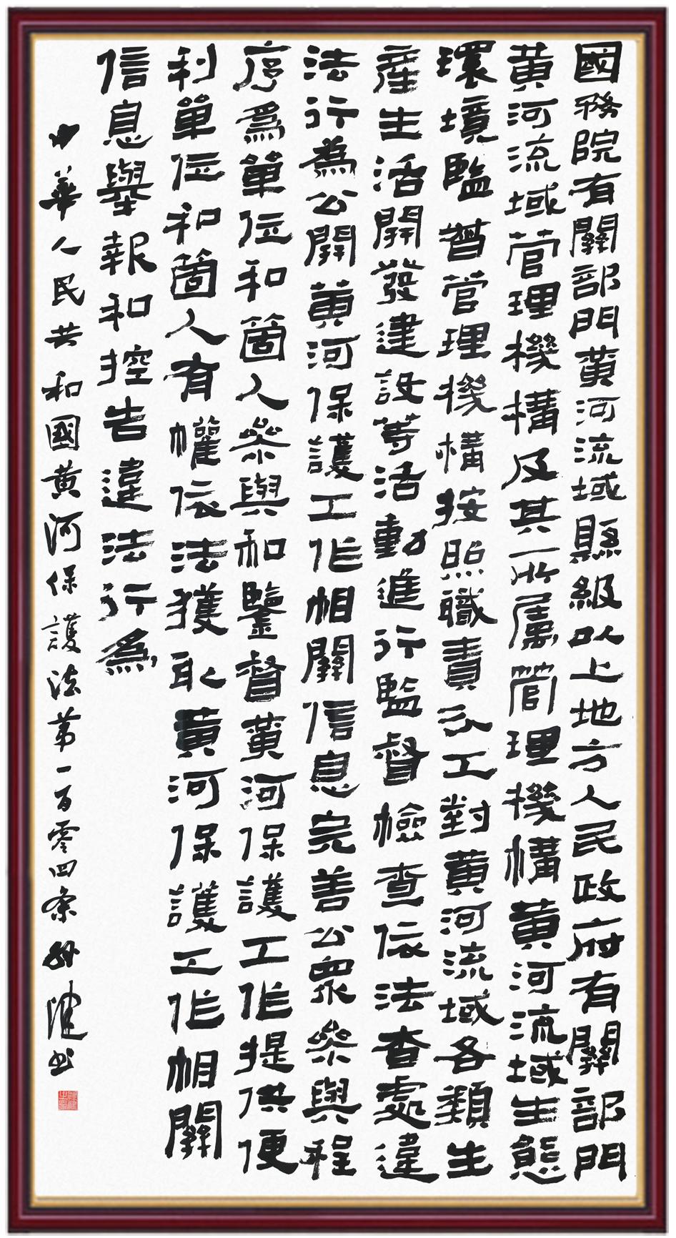 黃河寧,天下平。黃河是中華民族的發(fā)源地和搖籃,保護(hù)黃河是事關(guān)中華民族偉大復(fù)興的千秋大計?!吨腥A人民共和國黃河保護(hù)法》為推進(jìn)水資源節(jié)約集約利用、保護(hù)傳承弘揚(yáng)黃河文化、推動黃河流域生態(tài)保護(hù)和高質(zhì)量發(fā)展提供了有力法治保障。繼書寫《中華人民共和國民法典》《中華人民共和國憲法》《中華人民共和國澳門特別行政區(qū)基本法》《中華人民共和國香港特別行政區(qū)基本法》《中華人民共和國國旗法》《中華人民共和國國徽法》《中華人民共和國國歌法》《中華人民共和國法官法》等法律法規(guī)之后,法制日報社聯(lián)合沿黃九?。▍^(qū))司法廳、書法家協(xié)會,將筆端對準(zhǔn)《中華人民共和國黃河保護(hù)法》。