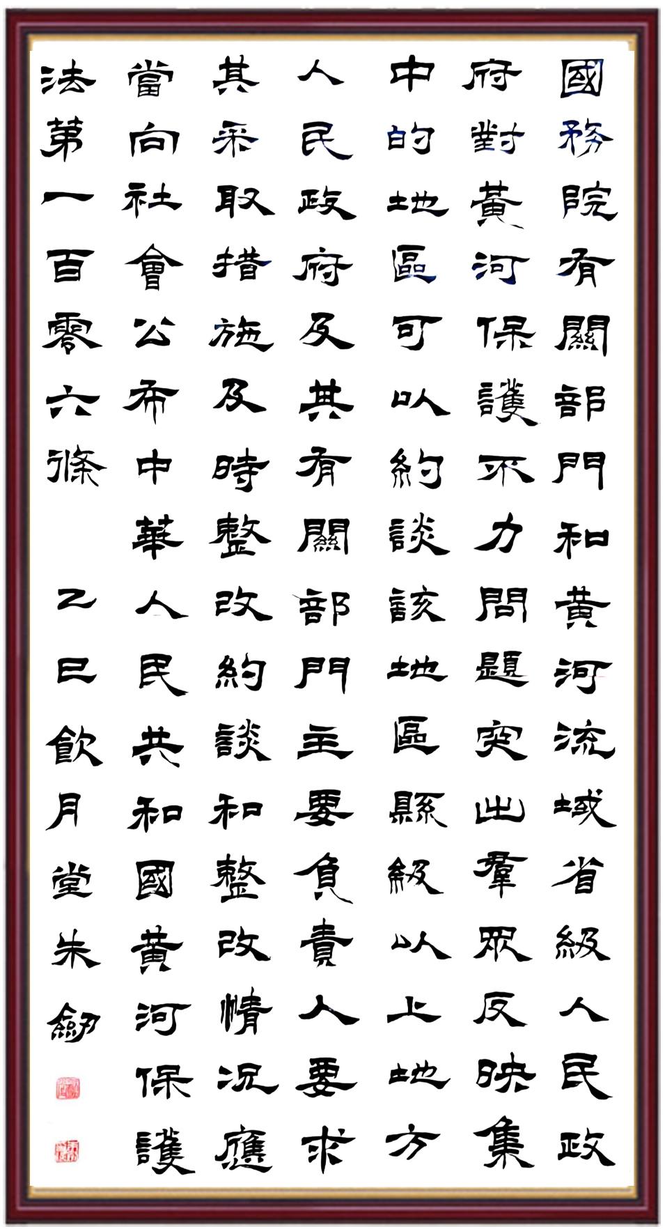 黃河寧,天下平。黃河是中華民族的發(fā)源地和搖籃,保護黃河是事關中華民族偉大復興的千秋大計?!吨腥A人民共和國黃河保護法》為推進水資源節(jié)約集約利用、保護傳承弘揚黃河文化、推動黃河流域生態(tài)保護和高質量發(fā)展提供了有力法治保障。繼書寫《中華人民共和國民法典》《中華人民共和國憲法》《中華人民共和國澳門特別行政區(qū)基本法》《中華人民共和國香港特別行政區(qū)基本法》《中華人民共和國國旗法》《中華人民共和國國徽法》《中華人民共和國國歌法》《中華人民共和國法官法》等法律法規(guī)之后,法制日報社聯(lián)合沿黃九省(區(qū))司法廳、書法家協(xié)會,將筆端對準《中華人民共和國黃河保護法》。