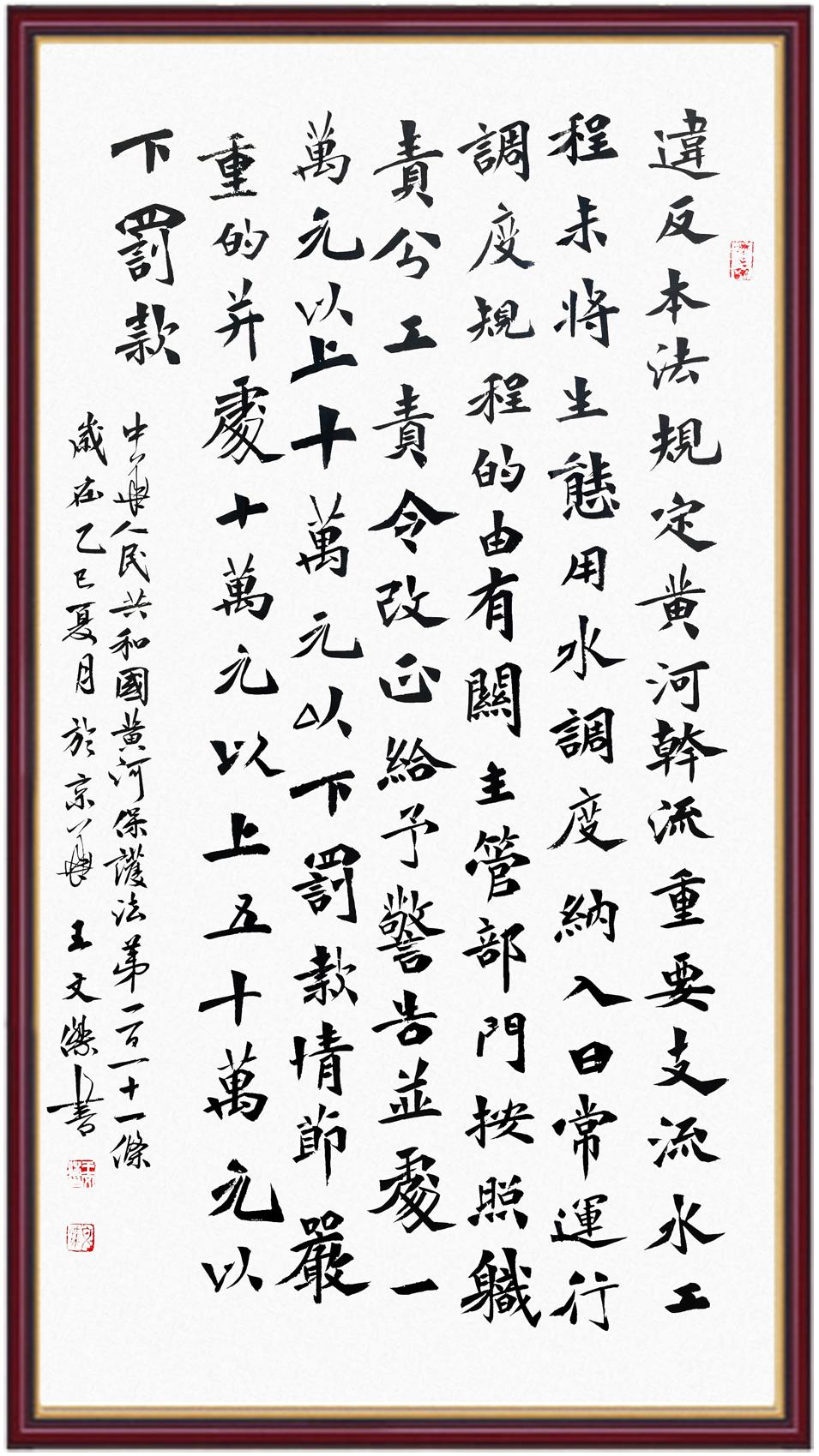 黃河寧,天下平。黃河是中華民族的發(fā)源地和搖籃,保護黃河是事關(guān)中華民族偉大復(fù)興的千秋大計?!吨腥A人民共和國黃河保護法》為推進水資源節(jié)約集約利用、保護傳承弘揚黃河文化、推動黃河流域生態(tài)保護和高質(zhì)量發(fā)展提供了有力法治保障。繼書寫《中華人民共和國民法典》《中華人民共和國憲法》《中華人民共和國澳門特別行政區(qū)基本法》《中華人民共和國香港特別行政區(qū)基本法》《中華人民共和國國旗法》《中華人民共和國國徽法》《中華人民共和國國歌法》《中華人民共和國法官法》等法律法規(guī)之后,法制日報社聯(lián)合沿黃九?。▍^(qū))司法廳、書法家協(xié)會,將筆端對準(zhǔn)《中華人民共和國黃河保護法》。