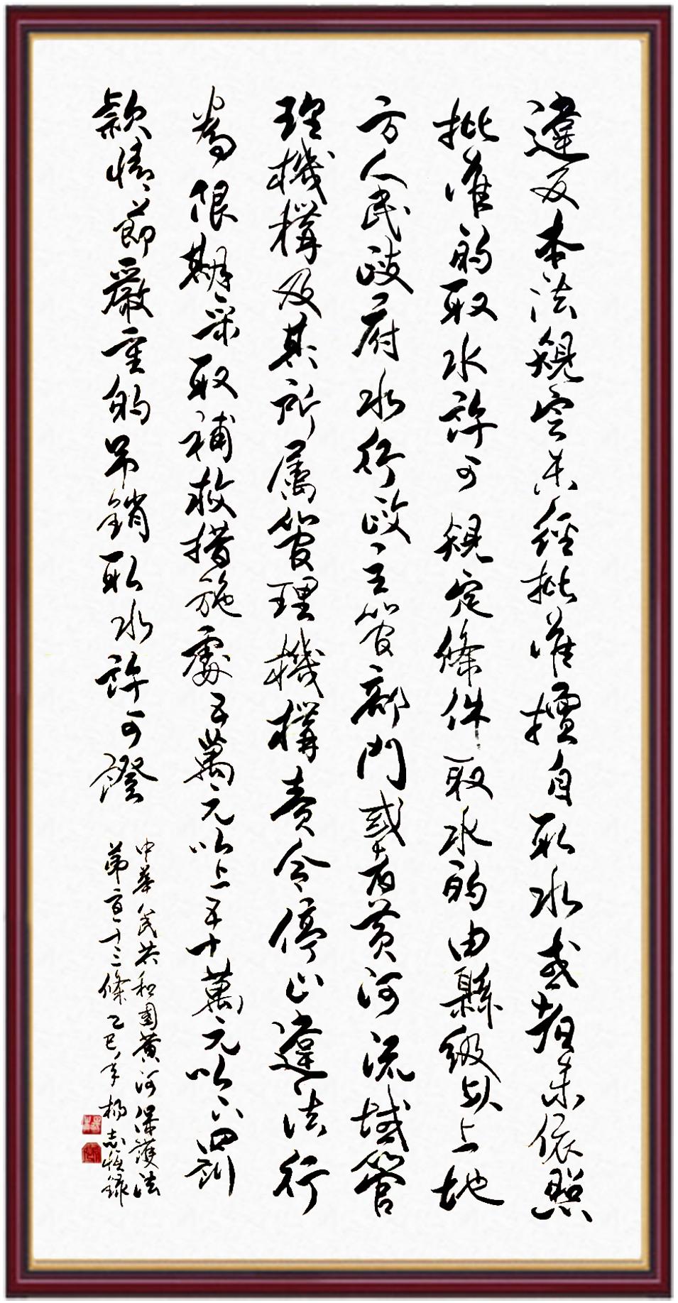黃河寧,天下平。黃河是中華民族的發(fā)源地和搖籃,保護(hù)黃河是事關(guān)中華民族偉大復(fù)興的千秋大計(jì)?!吨腥A人民共和國(guó)黃河保護(hù)法》為推進(jìn)水資源節(jié)約集約利用、保護(hù)傳承弘揚(yáng)黃河文化、推動(dòng)黃河流域生態(tài)保護(hù)和高質(zhì)量發(fā)展提供了有力法治保障。繼書(shū)寫(xiě)《中華人民共和國(guó)民法典》《中華人民共和國(guó)憲法》《中華人民共和國(guó)澳門(mén)特別行政區(qū)基本法》《中華人民共和國(guó)香港特別行政區(qū)基本法》《中華人民共和國(guó)國(guó)旗法》《中華人民共和國(guó)國(guó)徽法》《中華人民共和國(guó)國(guó)歌法》《中華人民共和國(guó)法官法》等法律法規(guī)之后,法制日?qǐng)?bào)社聯(lián)合沿黃九?。▍^(qū))司法廳、書(shū)法家協(xié)會(huì),將筆端對(duì)準(zhǔn)《中華人民共和國(guó)黃河保護(hù)法》。
