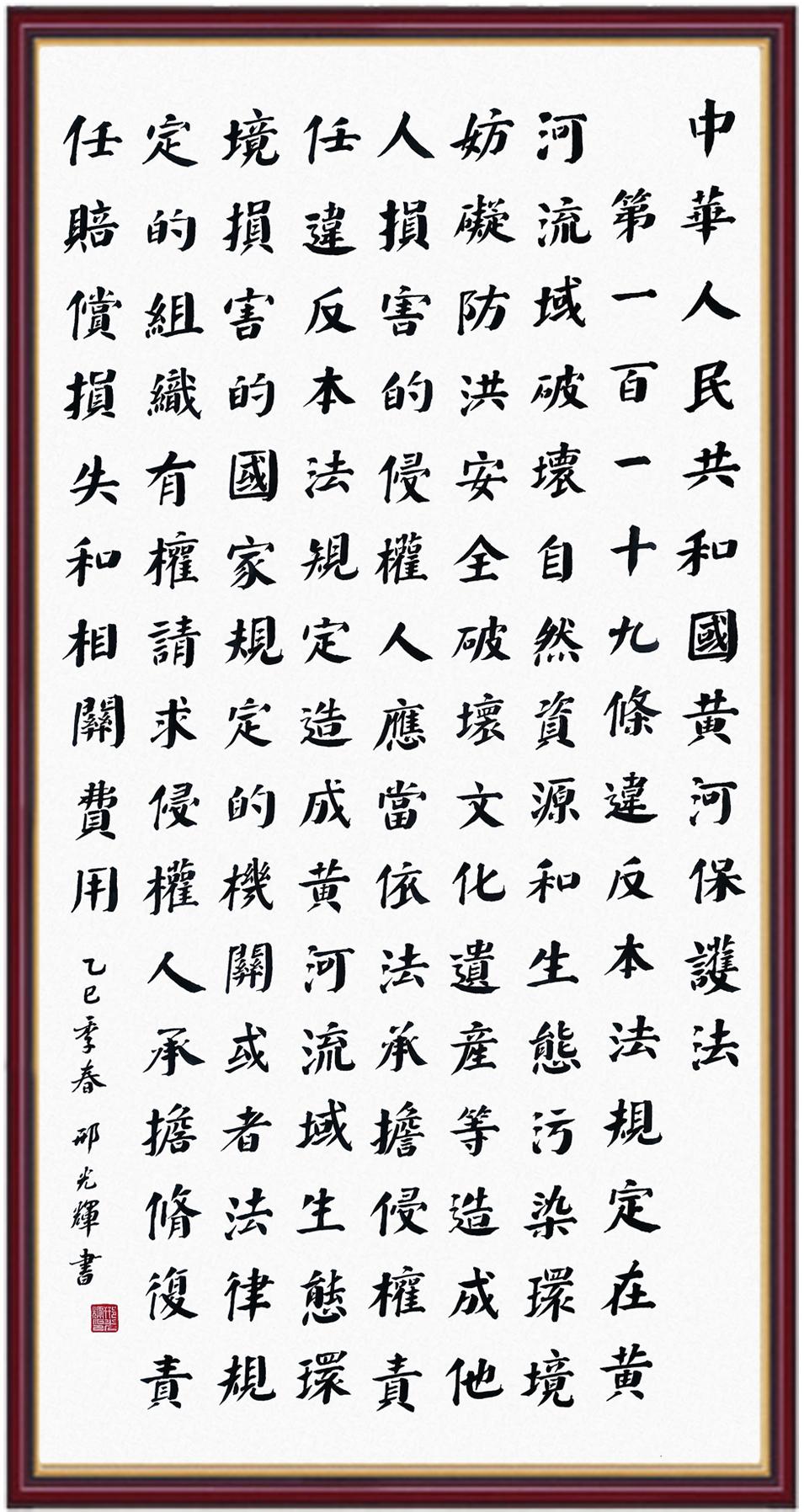黃河寧,天下平。黃河是中華民族的發(fā)源地和搖籃,保護(hù)黃河是事關(guān)中華民族偉大復(fù)興的千秋大計?!吨腥A人民共和國黃河保護(hù)法》為推進(jìn)水資源節(jié)約集約利用、保護(hù)傳承弘揚黃河文化、推動黃河流域生態(tài)保護(hù)和高質(zhì)量發(fā)展提供了有力法治保障。繼書寫《中華人民共和國民法典》《中華人民共和國憲法》《中華人民共和國澳門特別行政區(qū)基本法》《中華人民共和國香港特別行政區(qū)基本法》《中華人民共和國國旗法》《中華人民共和國國徽法》《中華人民共和國國歌法》《中華人民共和國法官法》等法律法規(guī)之后,法制日報社聯(lián)合沿黃九?。▍^(qū))司法廳、書法家協(xié)會,將筆端對準(zhǔn)《中華人民共和國黃河保護(hù)法》。