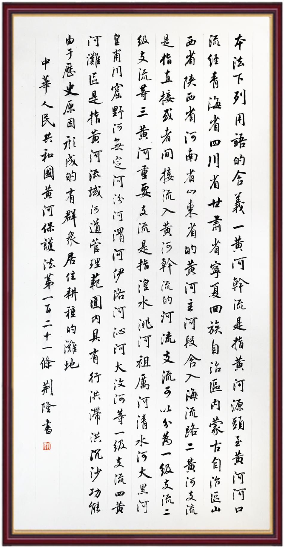 黃河寧,天下平。黃河是中華民族的發(fā)源地和搖籃,保護黃河是事關中華民族偉大復興的千秋大計。《中華人民共和國黃河保護法》為推進水資源節(jié)約集約利用、保護傳承弘揚黃河文化、推動黃河流域生態(tài)保護和高質量發(fā)展提供了有力法治保障。繼書寫《中華人民共和國民法典》《中華人民共和國憲法》《中華人民共和國澳門特別行政區(qū)基本法》《中華人民共和國香港特別行政區(qū)基本法》《中華人民共和國國旗法》《中華人民共和國國徽法》《中華人民共和國國歌法》《中華人民共和國法官法》等法律法規(guī)之后,法制日報社聯(lián)合沿黃九?。▍^(qū))司法廳、書法家協(xié)會,將筆端對準《中華人民共和國黃河保護法》。