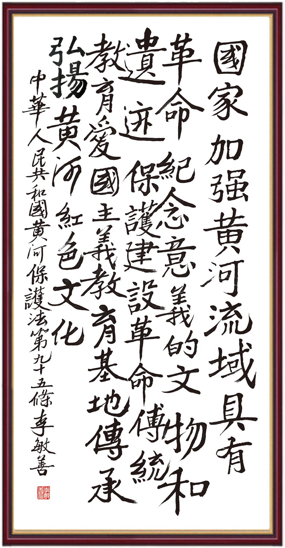 黃河寧,天下平。黃河是中華民族的發(fā)源地和搖籃,保護黃河是事關中華民族偉大復興的千秋大計。《中華人民共和國黃河保護法》為推進水資源節(jié)約集約利用、保護傳承弘揚黃河文化、推動黃河流域生態(tài)保護和高質量發(fā)展提供了有力法治保障。繼書寫《中華人民共和國民法典》《中華人民共和國憲法》《中華人民共和國澳門特別行政區(qū)基本法》《中華人民共和國香港特別行政區(qū)基本法》《中華人民共和國國旗法》《中華人民共和國國徽法》《中華人民共和國國歌法》《中華人民共和國法官法》等法律法規(guī)之后,法制日報社聯(lián)合沿黃九?。▍^(qū))司法廳、書法家協(xié)會,將筆端對準《中華人民共和國黃河保護法》。