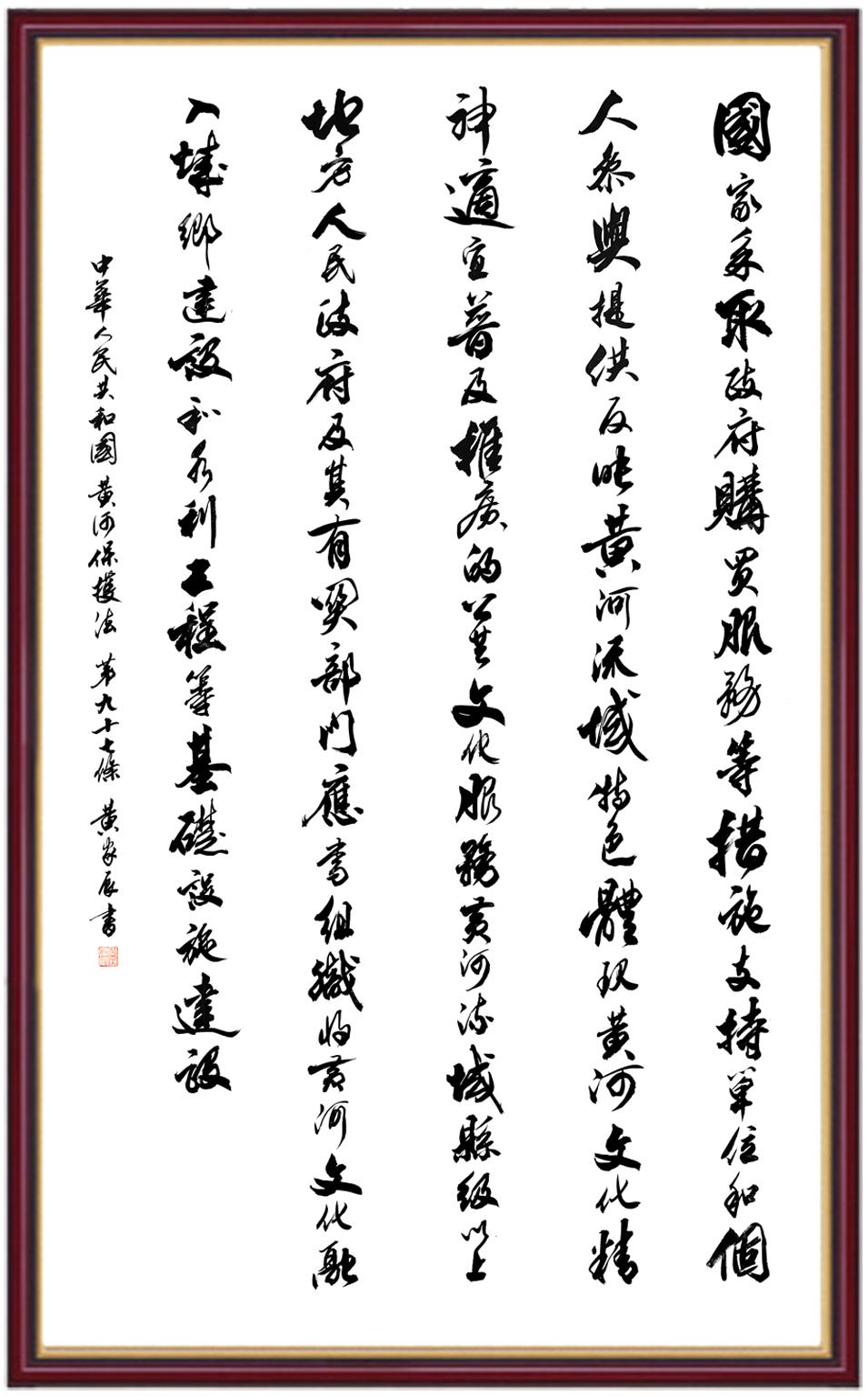 黃河寧,天下平。黃河是中華民族的發(fā)源地和搖籃,保護(hù)黃河是事關(guān)中華民族偉大復(fù)興的千秋大計(jì)?!吨腥A人民共和國黃河保護(hù)法》為推進(jìn)水資源節(jié)約集約利用、保護(hù)傳承弘揚(yáng)黃河文化、推動(dòng)黃河流域生態(tài)保護(hù)和高質(zhì)量發(fā)展提供了有力法治保障。繼書寫《中華人民共和國民法典》《中華人民共和國憲法》《中華人民共和國澳門特別行政區(qū)基本法》《中華人民共和國香港特別行政區(qū)基本法》《中華人民共和國國旗法》《中華人民共和國國徽法》《中華人民共和國國歌法》《中華人民共和國法官法》等法律法規(guī)之后,法制日報(bào)社聯(lián)合沿黃九?。▍^(qū))司法廳、書法家協(xié)會(huì),將筆端對準(zhǔn)《中華人民共和國黃河保護(hù)法》。