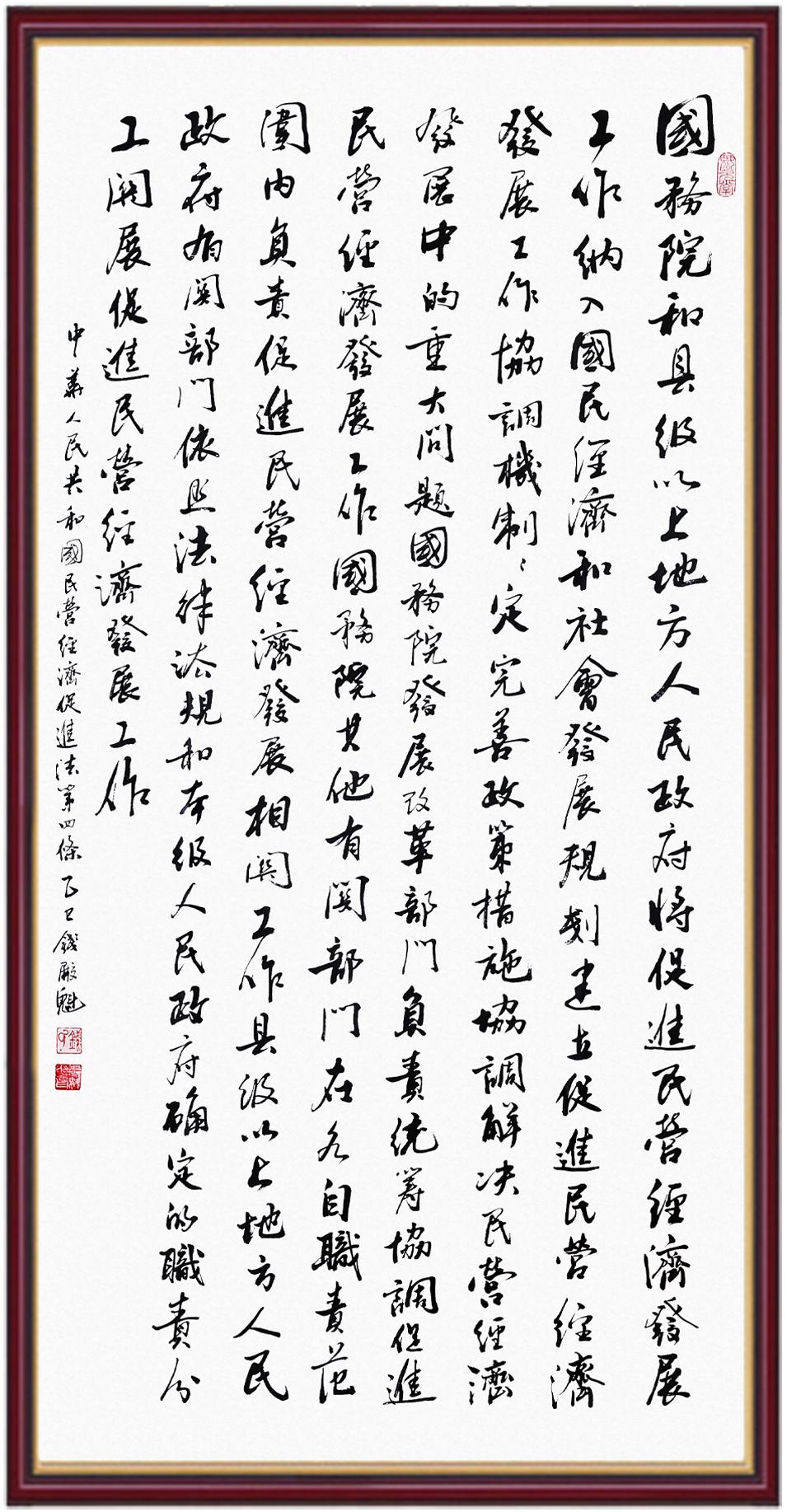 《中華人民共和國民營經(jīng)濟(jì)促進(jìn)法》自今年5月20日起施行。作為我國首部專門關(guān)于民營經(jīng)濟(jì)發(fā)展的基礎(chǔ)性法律,民營經(jīng)濟(jì)促進(jìn)法將支持和保障民營經(jīng)濟(jì)發(fā)展的法律制度融入中國特色社會(huì)主義法律體系,具有重大的法治意義,為促進(jìn)民營經(jīng)濟(jì)持續(xù)、健康、高質(zhì)量發(fā)展提供了堅(jiān)實(shí)的法治保障。為更好地學(xué)習(xí)、宣傳、貫徹這部法律,法治日?qǐng)?bào)社聯(lián)合司法部普法與依法治理局,開展“‘書·法’系列活動(dòng)之書寫《中華人民共和國民營經(jīng)濟(jì)促進(jìn)法》”活動(dòng)。