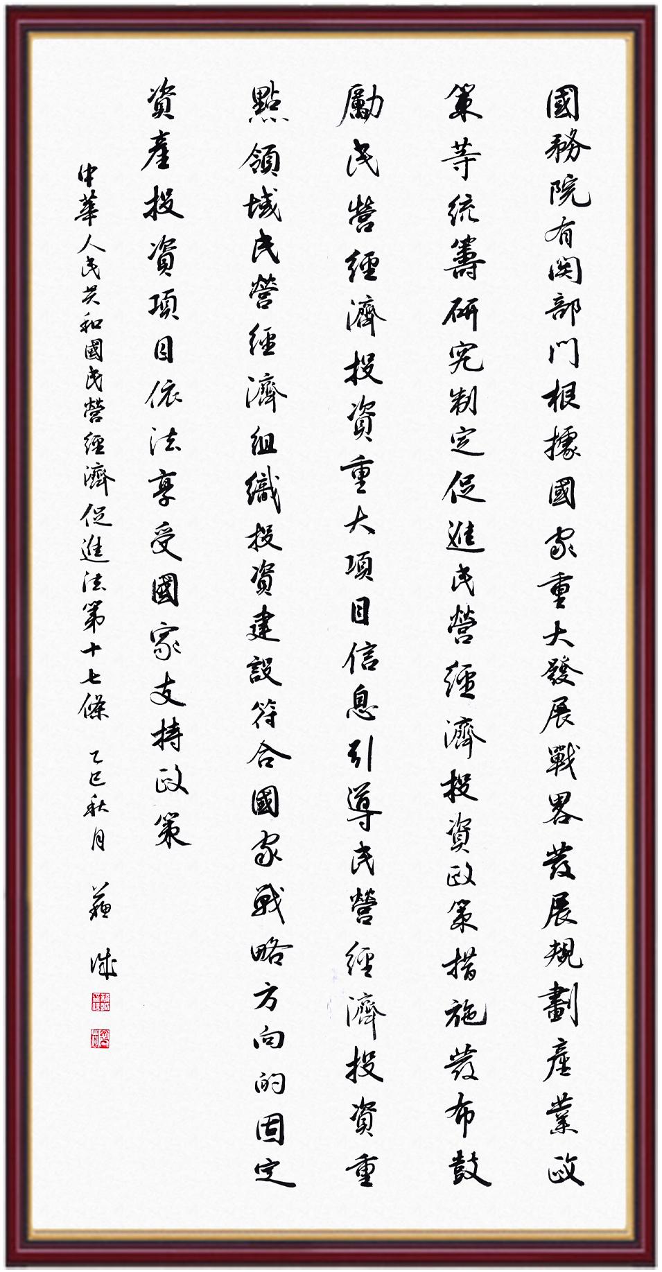 《中華人民共和國民營經(jīng)濟(jì)促進(jìn)法》自今年5月20日起施行。作為我國首部專門關(guān)于民營經(jīng)濟(jì)發(fā)展的基礎(chǔ)性法律,民營經(jīng)濟(jì)促進(jìn)法將支持和保障民營經(jīng)濟(jì)發(fā)展的法律制度融入中國特色社會主義法律體系,具有重大的法治意義,為促進(jìn)民營經(jīng)濟(jì)持續(xù)、健康、高質(zhì)量發(fā)展提供了堅(jiān)實(shí)的法治保障。為更好地學(xué)習(xí)、宣傳、貫徹這部法律,法治日報社聯(lián)合司法部普法與依法治理局,開展“‘書·法’系列活動之書寫《中華人民共和國民營經(jīng)濟(jì)促進(jìn)法》”活動。